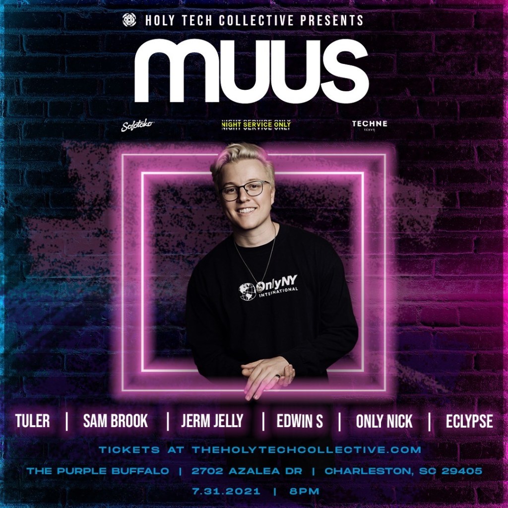 Holy Tech Collective’s next show at the Purple Buffalo is Saturday. The event will feature artist MUUS for his debut show in Charleston. He will be supported by Tuler, Sam Brook, Jerm Jelly, Edwin S, Only Nick and Eclypse.